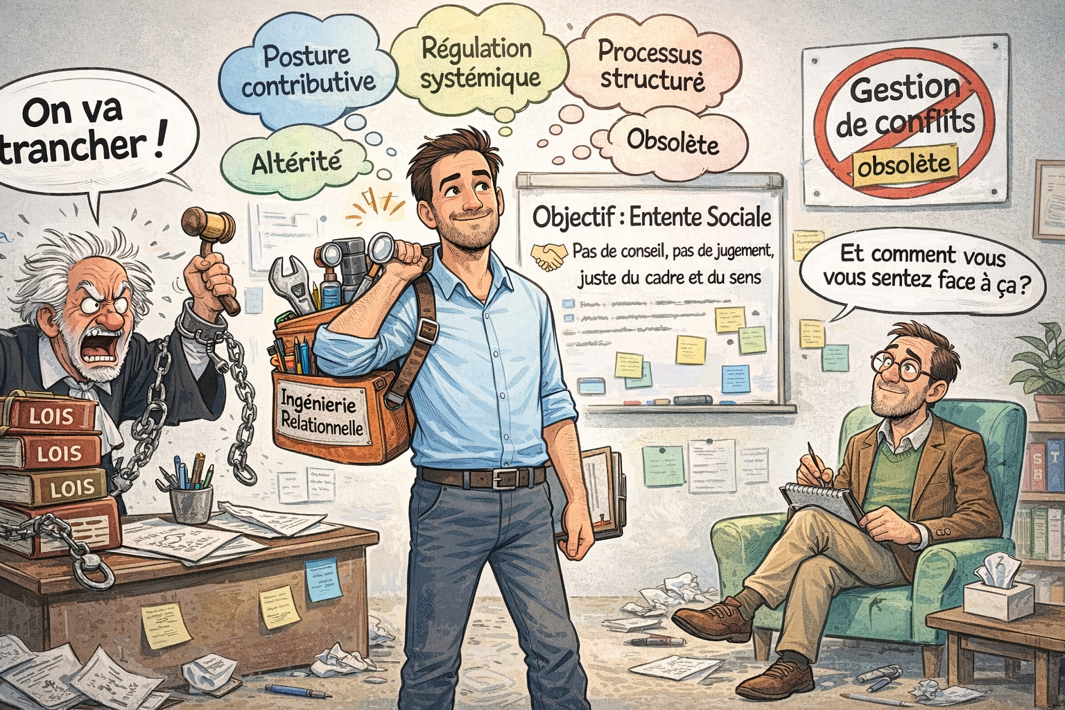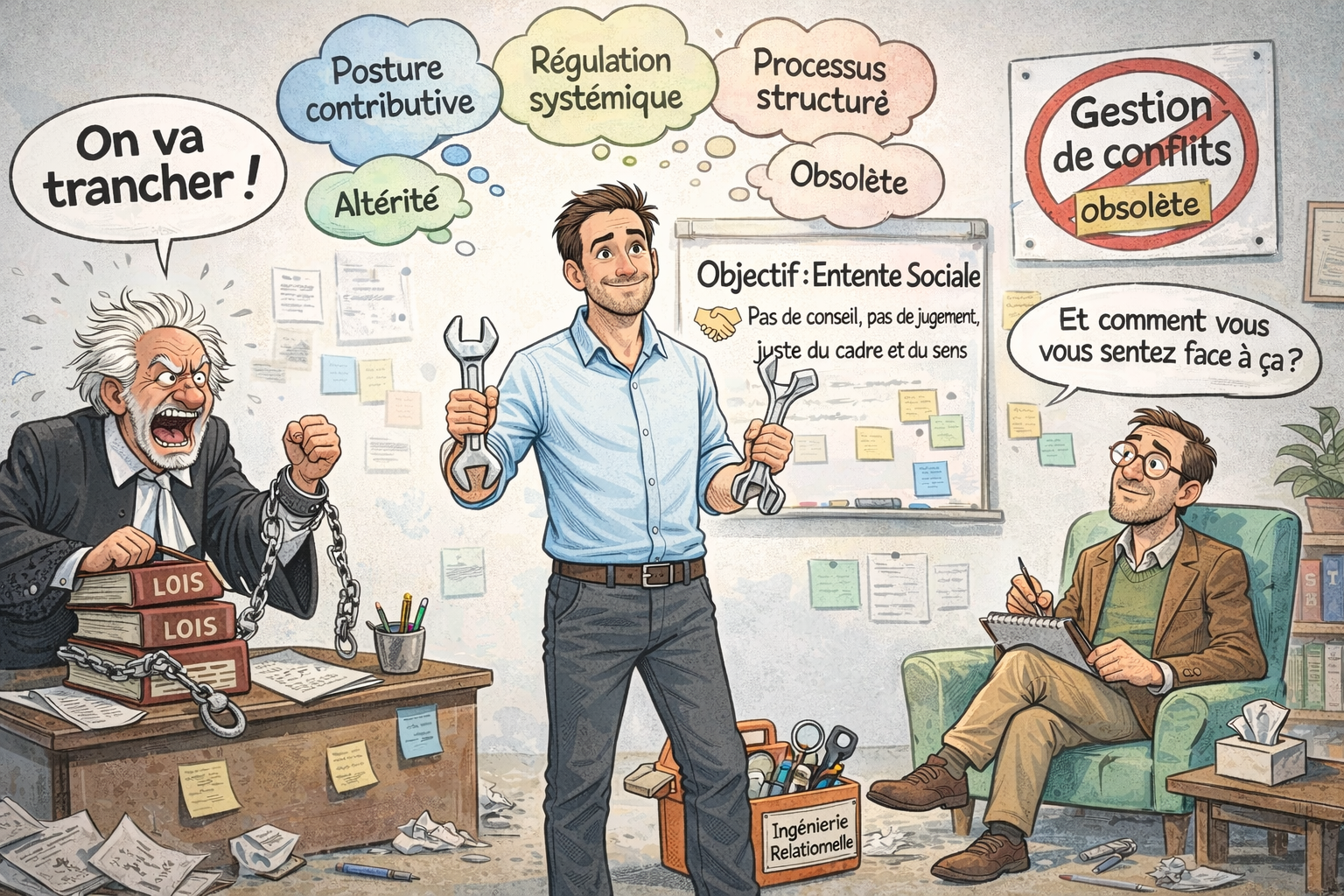 Dans ce domaine, sans doute plus vis-à-vis de tout autre, l’approche académique n’a en réalité aucune neutralité. Le médiateur est pluriel, parce qu’il s’agit de la manière dont est pensé ce qui constitue l’humain, les fondements de son intentionnalité et de sa responsabilité. La forme convenue masque ses propres présupposés scolastiques. Il en résulte une posture qui maintient la médiation dans une dépendance conceptuelle aux disciplines établies — le droit, la psychologie, la sociologie, voire l’économie de marché — au lieu de reconnaître pleinement sa spécificité. Pourtant, il est constaté que les approches satisfaisant à l’académisme actuel ne permettent pas de résoudre les différends, d’ailleurs, avec leurs pratiques, il est toujours question de “gestion de conflit”, pas de résolution.